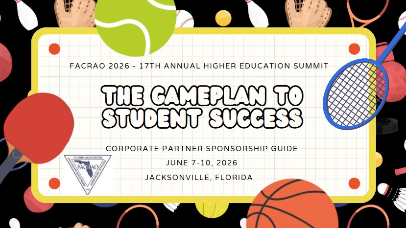 The Corporate Partners Program allows you to promote your services and products to professionals representing academic records, admissions, and enrollment services through a variety of sponsorship packages and opportunities. Whether you are new to FACRAO or a returning vendor, let’s be partners in 2025 - 2026! Below are our 2026 Sponsorship opportunities. We look forward to seeing you at the 2026 Higher Education Summit which will be held June 7 -10, 2026, at the Hyatt Regency Jacksonville Riverfront.